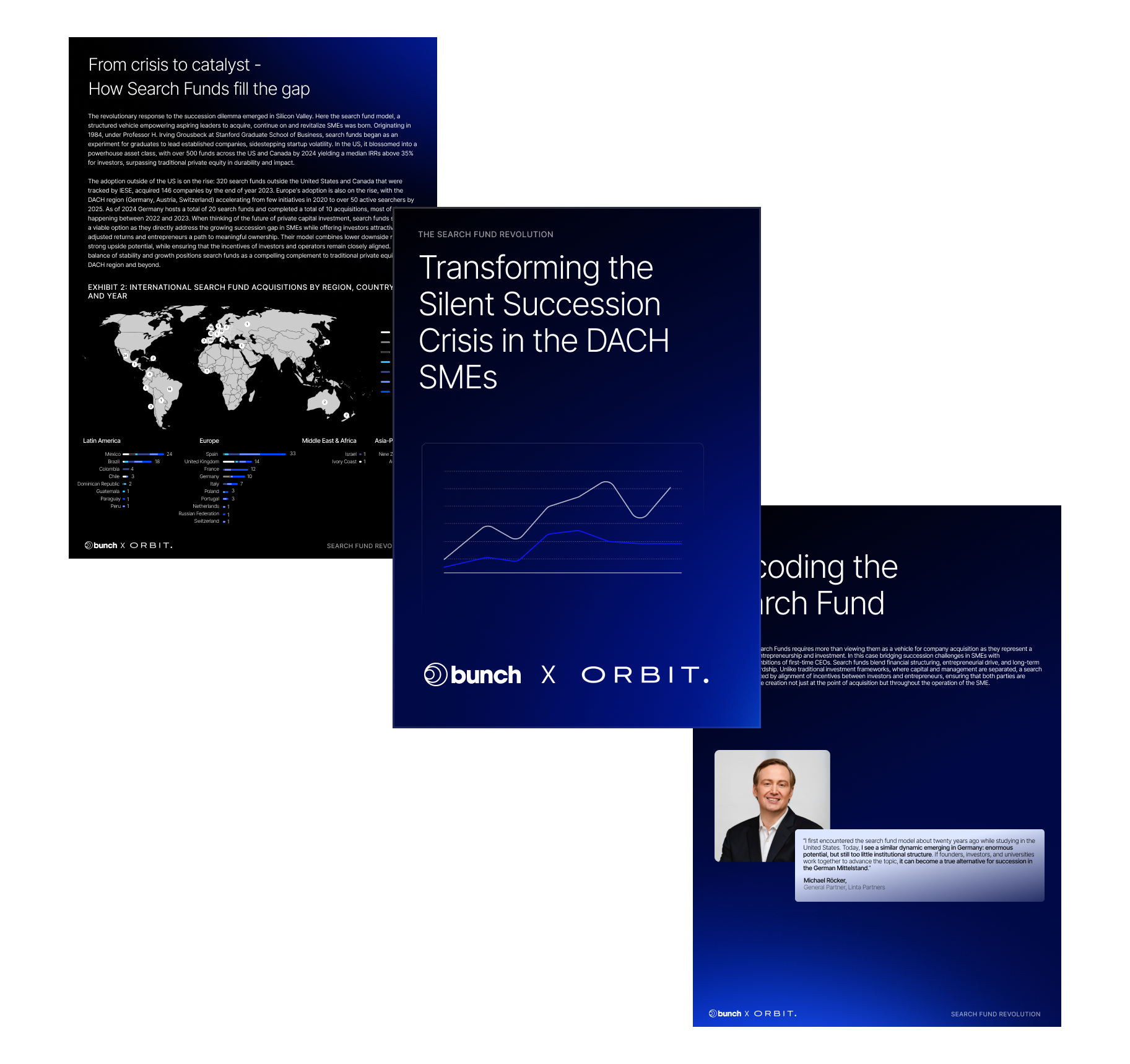 This White Paper by bunch and Orbit highlights the Search Fund as a modern solution for business continuity. By pairing ambitious entrepreneurs with long-term investors, Search Funds make ownership transitions smoother and growth more sustainable.